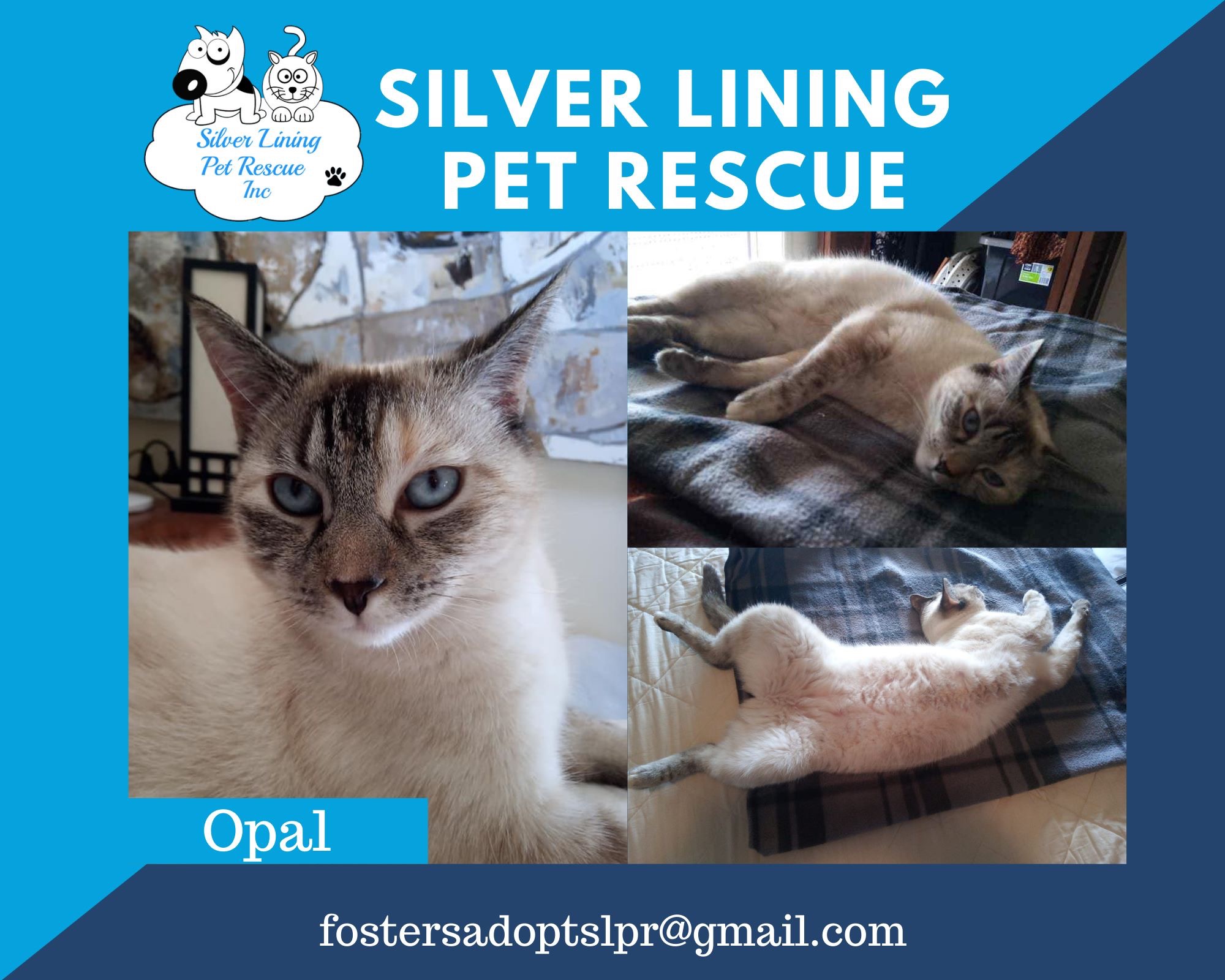 If you would like to meet me please email the rescue at fostersadoptslpr@gmail.com or pm the Silver Lining Pet Rescue Inc facebook page.