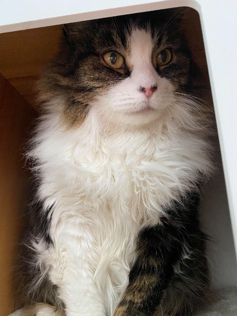 Chanelle aka Nellie would suit a quiet home, in which she can grow her confidence. She is shy and likes to hide at first and doesn't like sudden movements but when she gets to know you gives the best head bops in return for head scratches. She likes to stay close to the ground but once comfortable will happily get on your level. She has the occasional litter accident but don't we all. Nobody's perfect. Chanelle has a beautiful long multicoloured coat that needs regular grooming, although she is not too keen on it. Her ideal home would be one with no other animals where she can be the centre of your world. She is also not currently a lap cat but with the right attention could be a gorgeous rug for your legs😊