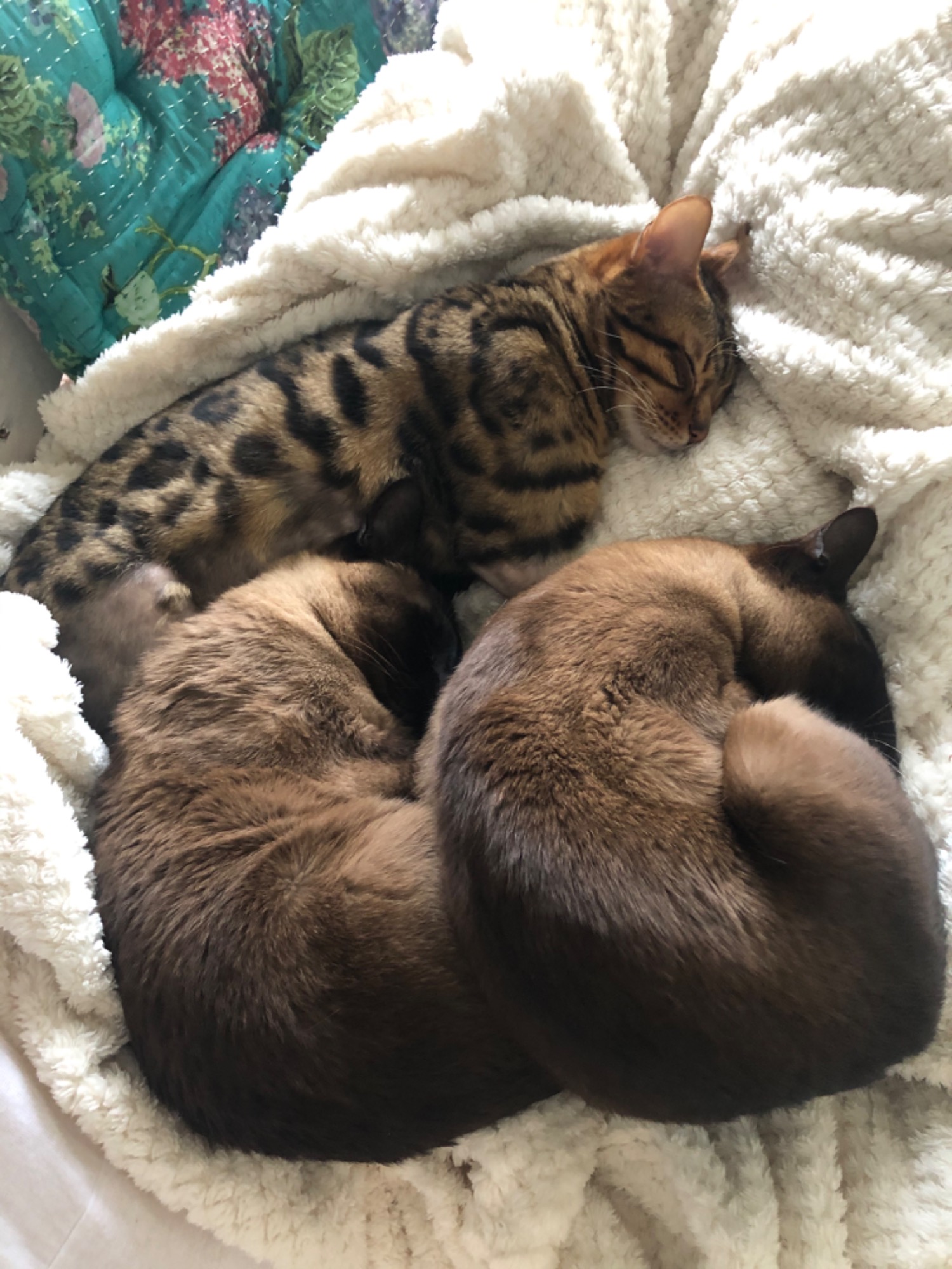 Tulsi is a 6 year old Tonkinese (half Burmese, half Siamese). She has a lovely, friendly, affectionate nature and is great with children and everyone! Friends often comment when they come over at how ‘non-cat-ish’ our cats are and how they don’t like cats usually but ours are so lovely. She is often a lap cat and is happy to be picked up and carried around a bit, however is also happy to be a little independent when it suits her. She never scratches or hisses. She will talk to you quite a bit and can be quite vocal when she’s hanging around you, often wanting to see what you’re doing. She is very cuddly with Samba and Aja and is often curled up snuggling with one or both of them.