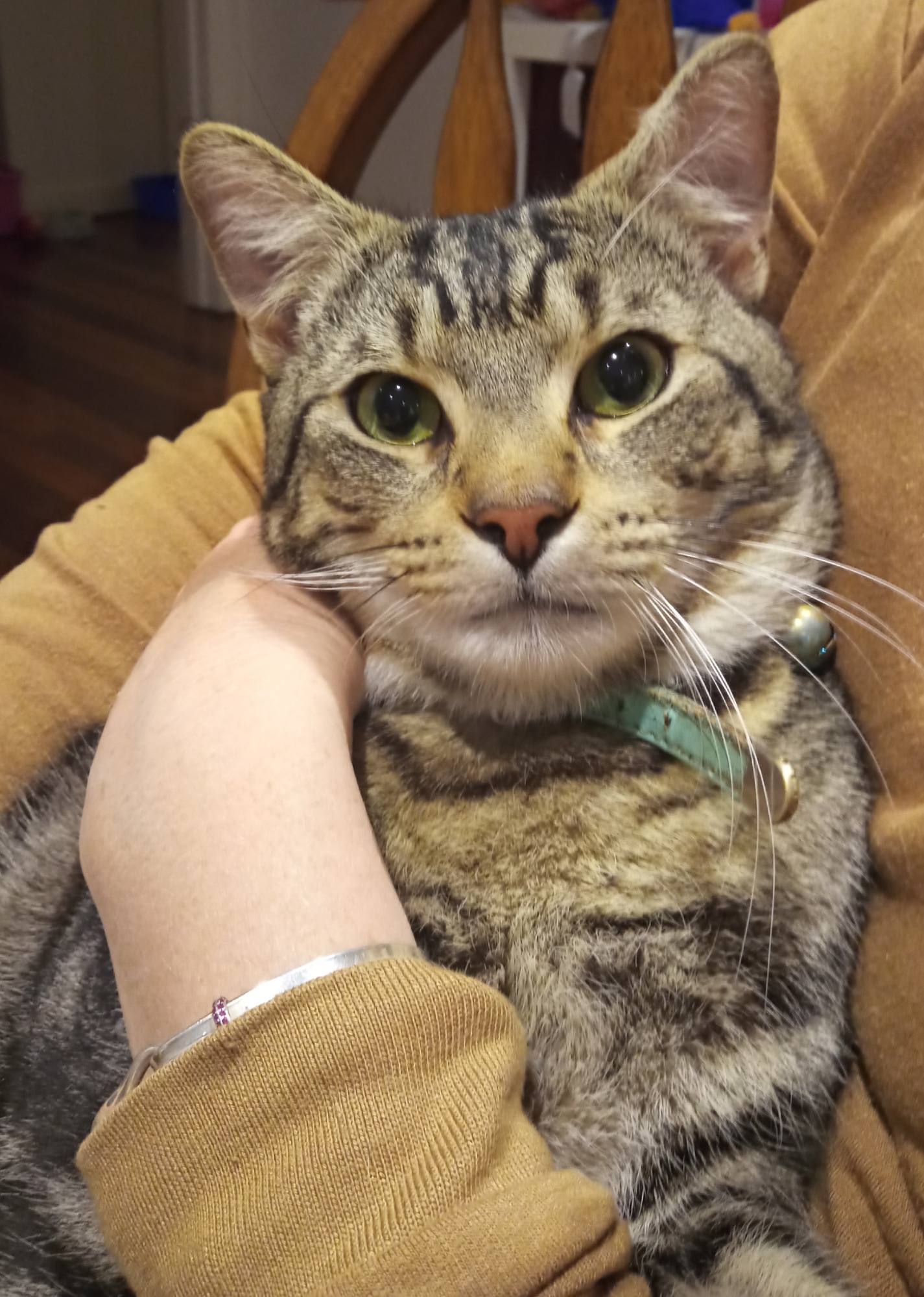 He's very friendly & likes to know you're around so he can find you for cuddle time.