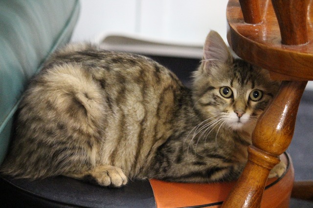 Omi is a sister to Oak, they both came to us as anti-socialised kittens. Omi is still a very shy girl when it comes to human interaction. At this time we are still unsure whether she will be an affectionate or lap cat. Omi will need an owner in a quite home who is patient with her and will give her the space and time to move at her own pace and learn to trust her new human, which could take some time. Omi loves to play, especially with a ping pong ball. She loves to run around with her foster brother and sisters and cause a bit of chaos. She’s definitely the crazy one. Omi loves her dog foster brother. She will lay down on the bed with him at night and loves to go nose to nose with him when he is inside. Omi is microchipped, desexed, wormed and vet checked. She is currently located in Goulburn and is available from the 1st October.