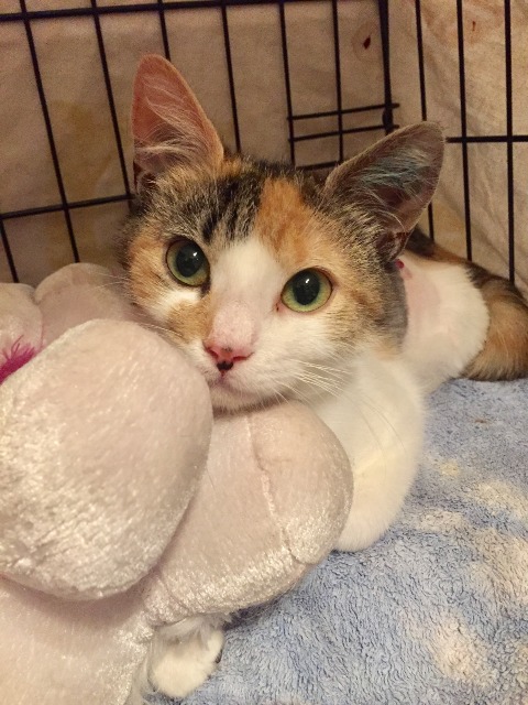This sweet little calico has so much love to give the right person, they'll need to be patient as she still runs and hides a lot, but she's getting more confident and sassy by the day.