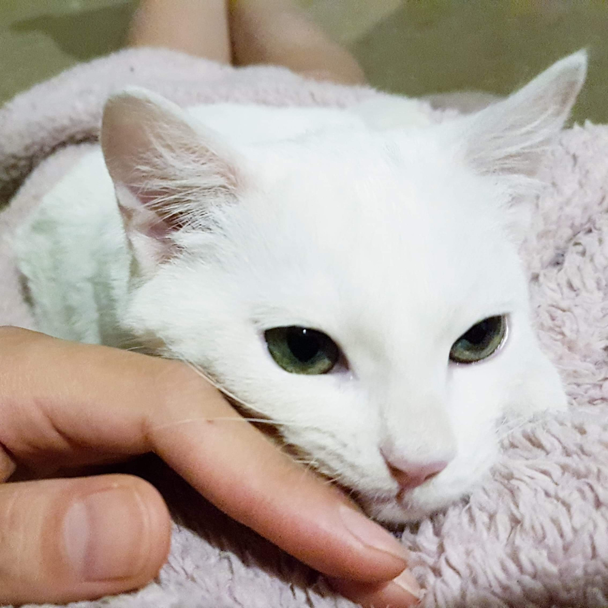Chompy is a stunningly gorgeous kitten with a big purr. He enjoys morning cuddles, cheek rubs, face to face smooches, little mousey toys, burrowing under his blanket and also chicken. However, he is a special kitten that has had a rough start to life, and has only recently learnt that humans are not so scary. He can still be scared of new things. But no matter how scared he has been, how much he used to hiss, he has never ever scratched or bitten, which why we know he will grow up to be the nicest kitty cat. He will require a quiet, calm household with no young children, or dogs, he would LOVE some sociable cat friends though! He prefers female humans (it helps if you have a soft sherpa dressing gown too) and it would help him get used to you if you are home most of the time. He may take a little while to come out of his shell, and would like a small room or crate to stay in at first to acclimatize to new surroundings. Chompy will reward your patience and kindness ten-fold with the sweetest little nuzzles and the cutest face smooches.