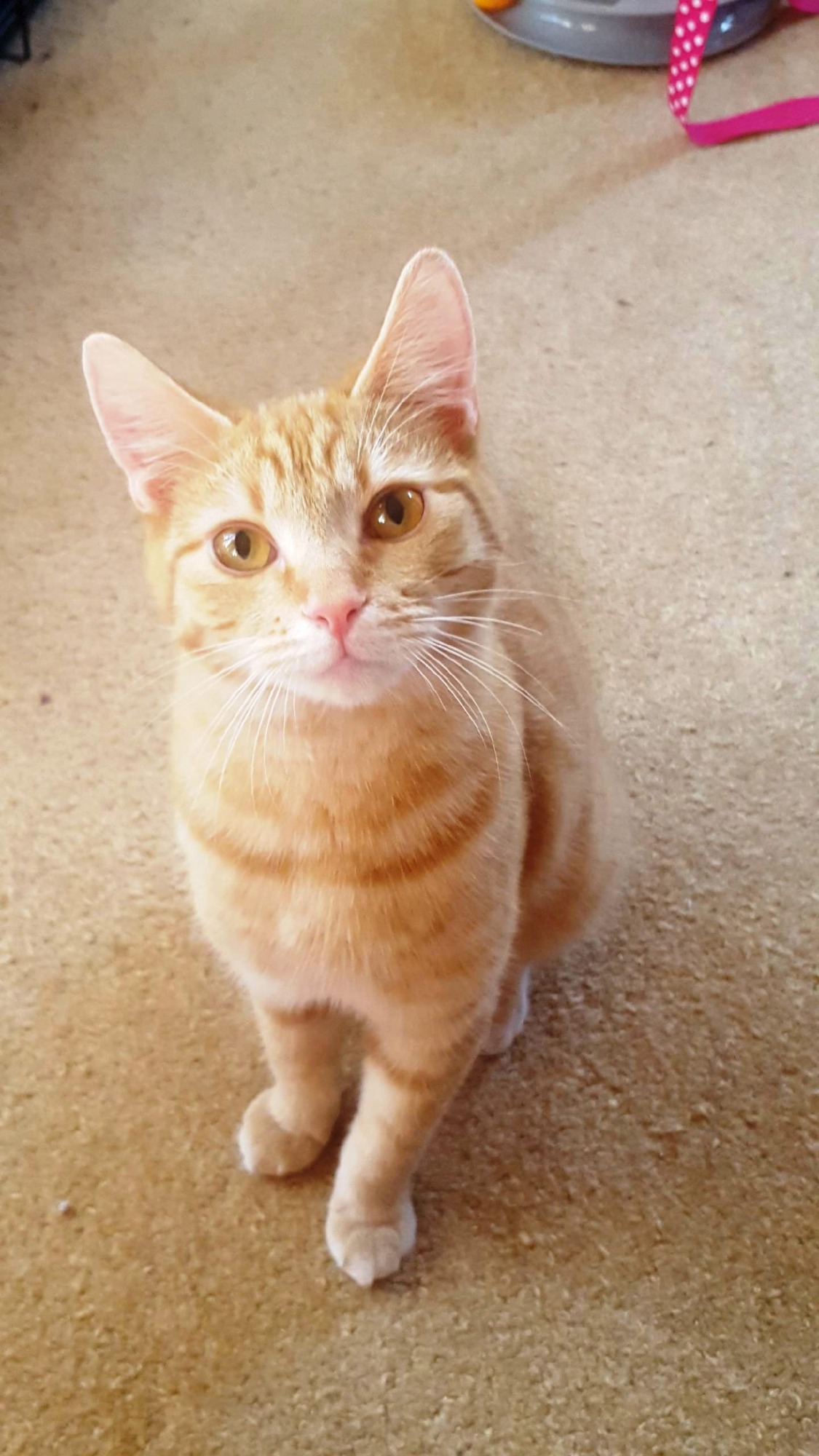 Mickie has lovely ginger spots and stripes, and the sweetest pink nose. He is the first to come out and get a pat with his tail straight up and will rub his nose on your hand to get you to pat him. He will roll over on his back to offer his round belly for scratches too, so cute. He is also getting used to me picking him up if I’m sitting on the floor and can put him on my lap for some pats. He is very loving and likes long strokes along his body.