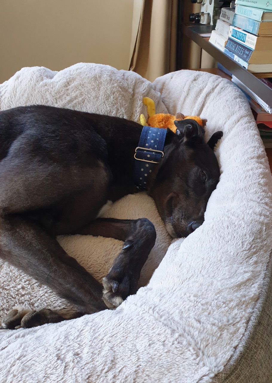 Suspected old racing injuries means that Manny’s muscles spasm occasionally, which can be managed with acupuncture and massage (yes, for dogs!). He loves a good rub down as it’s an opportunity for more pats!
