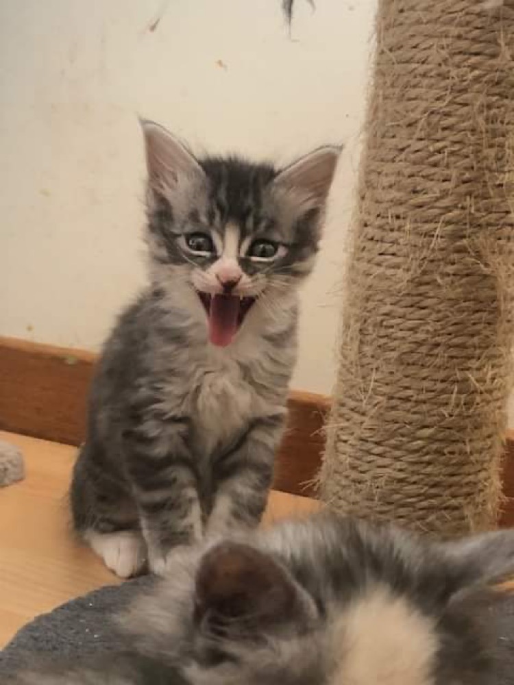 Sup? I’m Nougat! I’m an energetic little boy who loves playing with my toys and my brothers and sisters. I’m very happy to settle down on your lap for a little bit, but only if its on my terms. I’ve been in a house with other cat brothers ands sisters, although that was awhile ago so you might want to give me some time to adjust If I’m getting a new brother or sister. I’ve never seen a dog before, so I’m unsure how I would react if I ever met one, but If you give me some time to adjust, I’m sure I’ll be fine. I sometimes choose to chew on things I’m not meant to, like wires, so you might want to keep a close eye on me for awhile and teach me that its bad to chew on things I’m not meant to. I can’t wait to meet you in a couple of weeks after I’m ready to be adopted! Peace out!