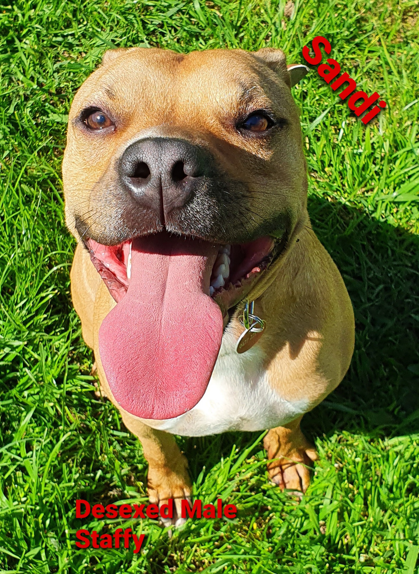 Our people devoted staffy x boy Sandi is ready to start the journey of finding his family. The staffy breed is a strong bonding breed of dog and this fellow is certainly devoted to his people. He is estimated to be between 2 - 4 years of age.
