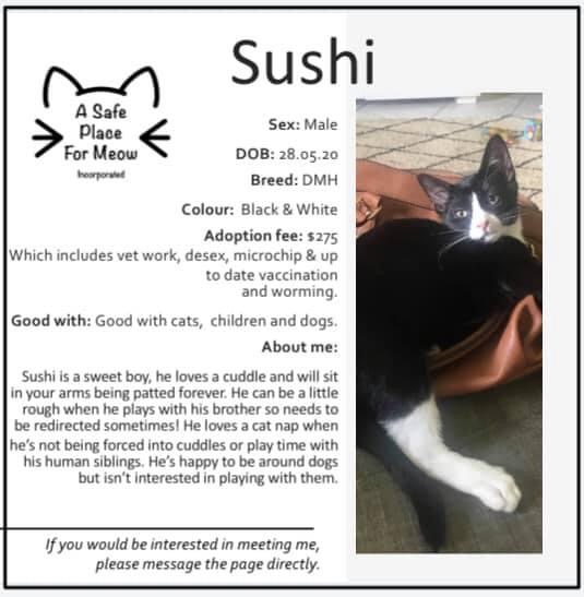 Sushi is a sweet boy, he loves a cuddle and will sit in your arms being patted forever. He can be a little rough when he plays with his brother so needs to be redirected sometimes! He loves a cat nap when he’s not being forced into cuddles or play time with his human siblings. He’s happy to be around dogs but isn’t interested in playing with them.