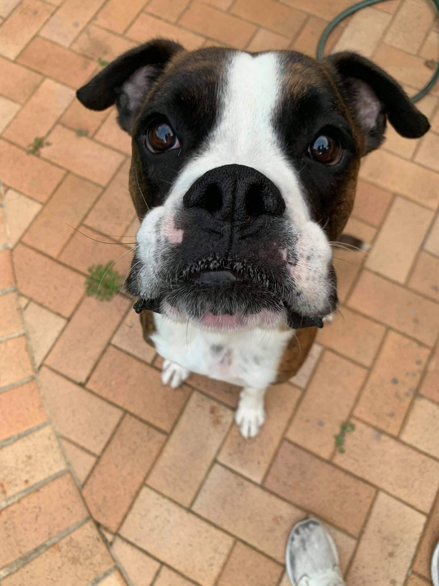 This sweet boy here is Koda, he is what you'd imagine a young typical energetic Boxer to be. He is a happy, wiggly boy but can be really boisterous when meeting new dogs or people, and is often misunderstood.