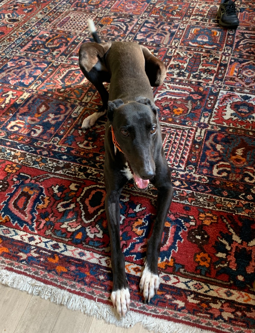 Mauri is one of those special black greyhounds with a face like an angel. His perpetually puppy-like appearance endears him to everyone he meets and makes him all too easily forgiven for any cheeky behaviour he might show!
