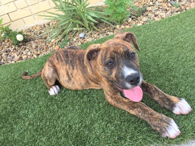 I am a gorgeous girl who loves to be loved. I am lots of fun, I will need an owner who can continue teaching me to be a well behaved doggo, as I am going to be a big girl when I grow up. I am very much a family member. I want to be wherever my family is at. I am currently living with 2 human foster brothers who love kicking the soccer ball around with me in the back yard. They also have a grumpy 15-year-old dog, who tolerates me, but I know when he’s had enough and find someone else to play with. I have also had visits with my rugrat brother Stu, and his dog brother George. We love a good game of chasey and wrestling. All my human visitors fall in love with me instantly.