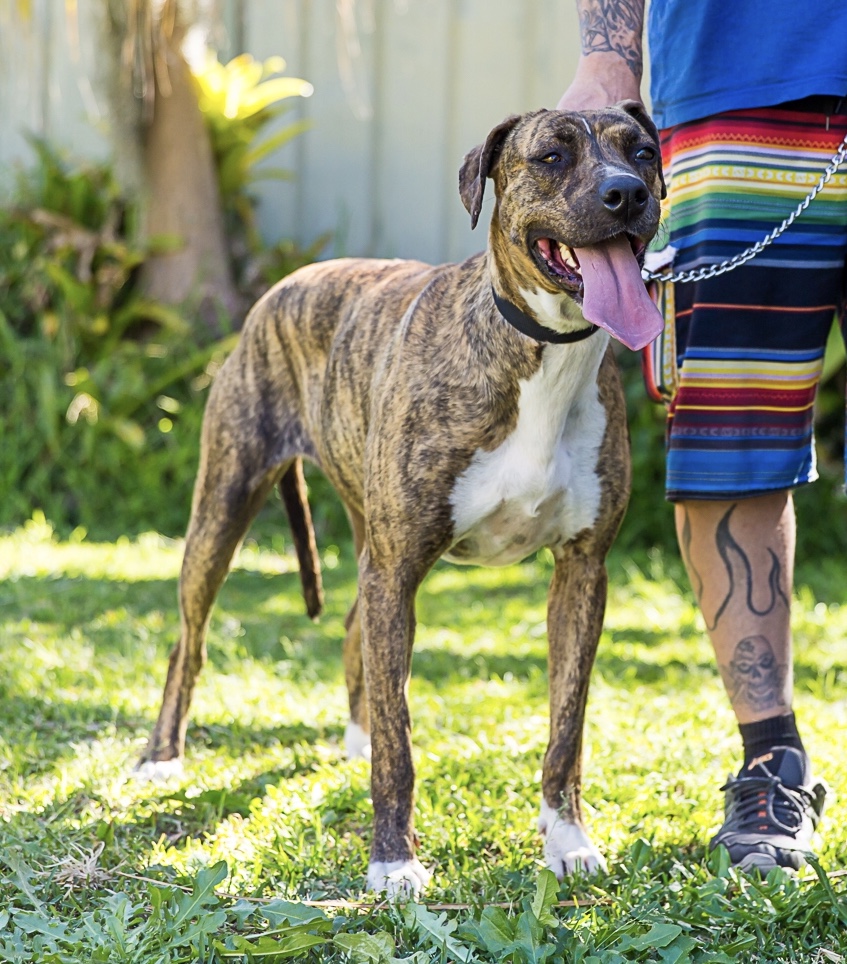 Hi I’m Bindi and I’m a friendly and well-behaved 4 and a half year old Bull Arab x girl. Yes sure I can hear you thinking “oh another Bull Arab up for adoption” but you haven’t met one as exceptionally pretty and sweet as me !! I’m a very tall girl (likely part Great Dane) with long legs, beautiful brindle markings and big soft eyes. I’m actually blind in one eye but this lack of vision doesn’t dampen my enthusiasm at all.