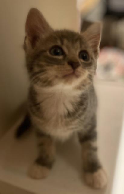 Meet teeny Nyirdi. Such a little kitty compared to her siblings. She's a lovely grey kitten with white mittens. She is in foster care with 2 adult resident cats and siblings Jett and Mighty. Loving foster care and the brand new toys and cat trees for her to play on!