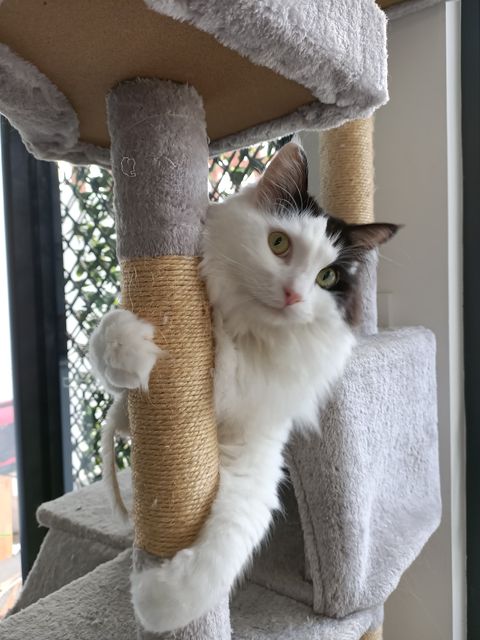 He loves to climb on the cat tower, and will let you know when he wants to play and be chased around the house. He has the most adorable habit where he will put his forehead against yours before giving you a kiss.