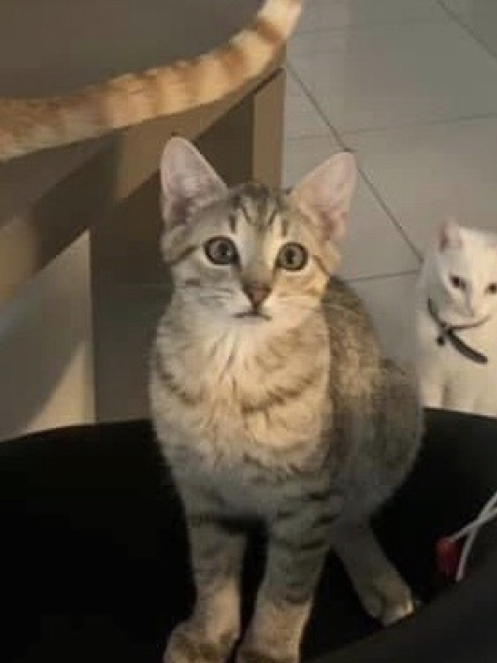 Don’t be put off by grumpy little man face. I’m actually a happy little man who is slowly finding my feet, I love to play with my older brother and annoy my sister every day. I have the cutest meow and I love love love my food, I like to nibble on toes too.