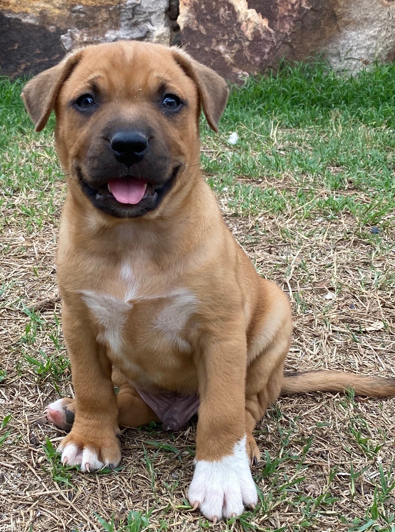 This handsome fellow is a mastiff x but looking at the size of his parents he will be medium size. Buddy is a happy fellow and loves his humans he is great with kids, other dogs and cats. He loves his cuddles and definitely playing in the sun. Buddy will go home with his own puppy pack and one month of worming treatment.
