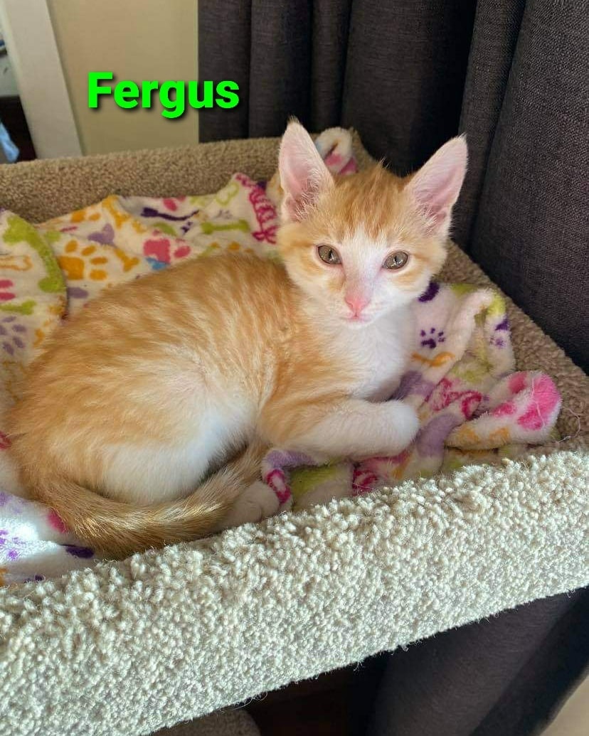 Sweet boy Fergus is now ready to find his lifetime home like his sister Massie. After being found in farm machinery, bottle raised and fostered in a home with other cats, dogs and children this fellow will cope with most homes.