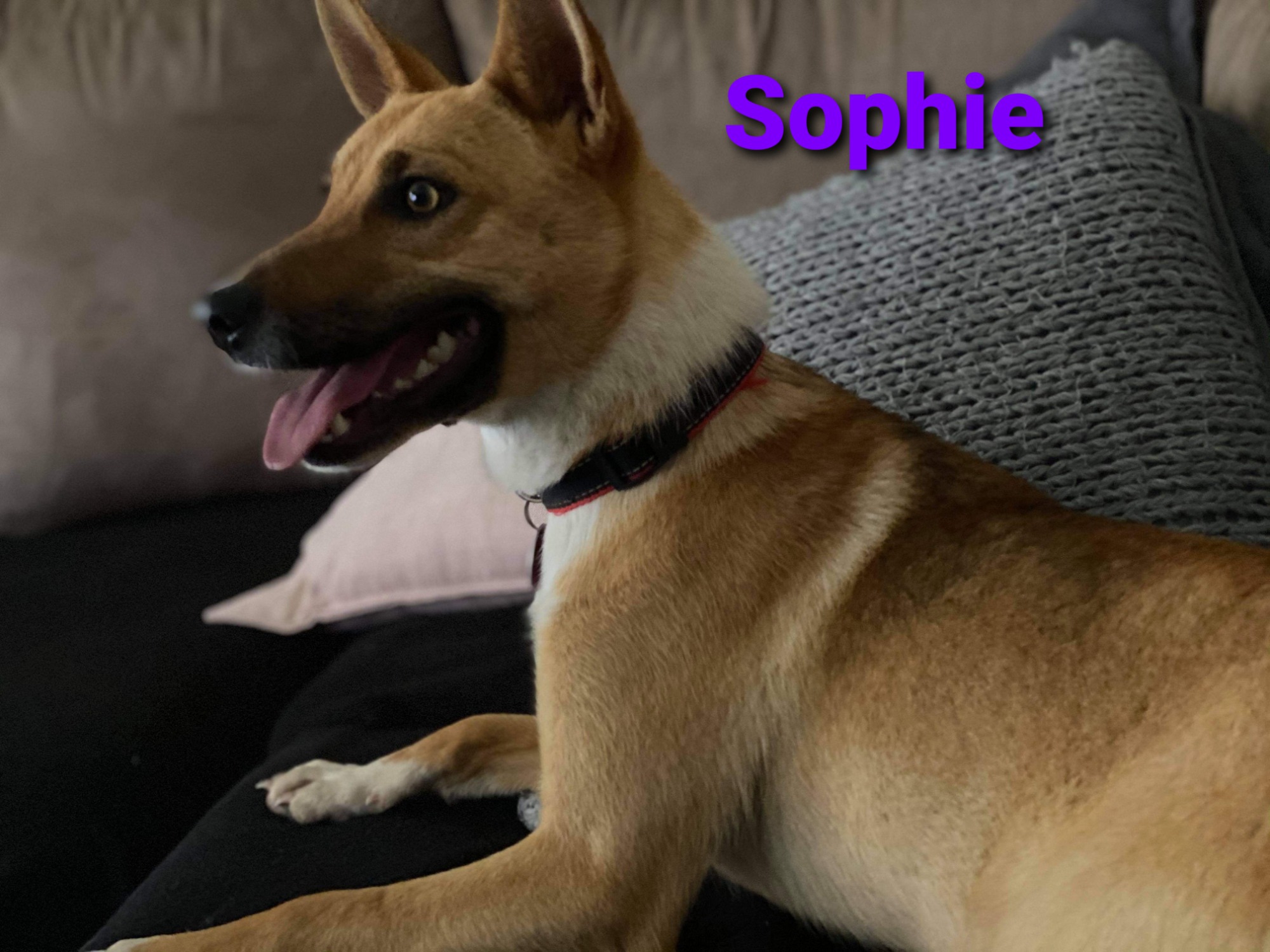Sophie is a lover....a lover of people. She is an 11 month old mixed breed dog (german shepherd x kelpie x heeler x ridgeback) that is the size of a small kelpie.