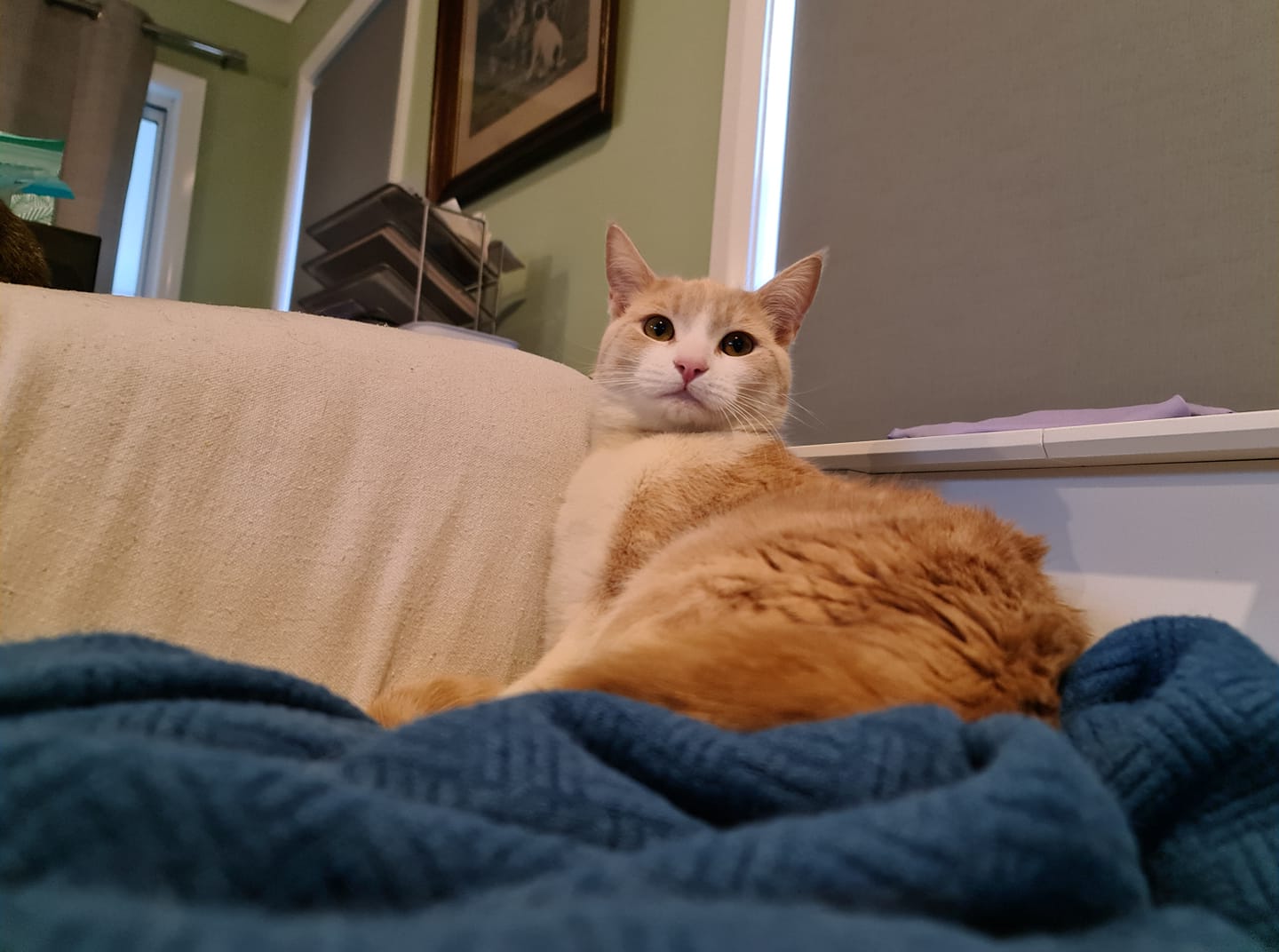 Custard now: While still timid at times, Custard is basically a puppy. He follows his foster carers around and trots alongside them. He has loads of energy and is always ready to rumble with the other cats in the house. He LOVES to play with other cats and is obsessed with toys. He carries his favourites around in his mouth so he always knows where they are. When it is time to rest, Custard is happy to curl up on the lounge and watch some tv. He has started seeking us out for pats and cuddles which is amazing!