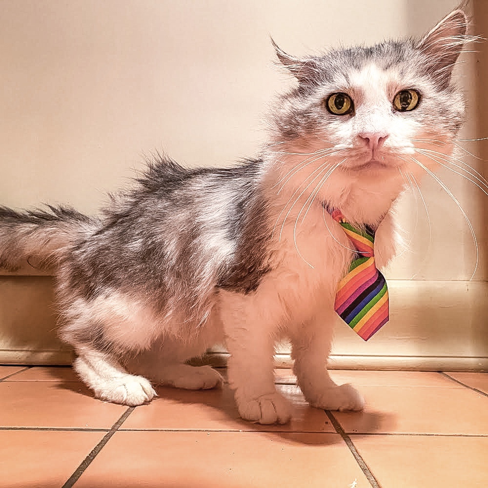 Mr Business is litter box trained. His luxurious froofy coat will need a brush every now and then, which he’s been fine with.