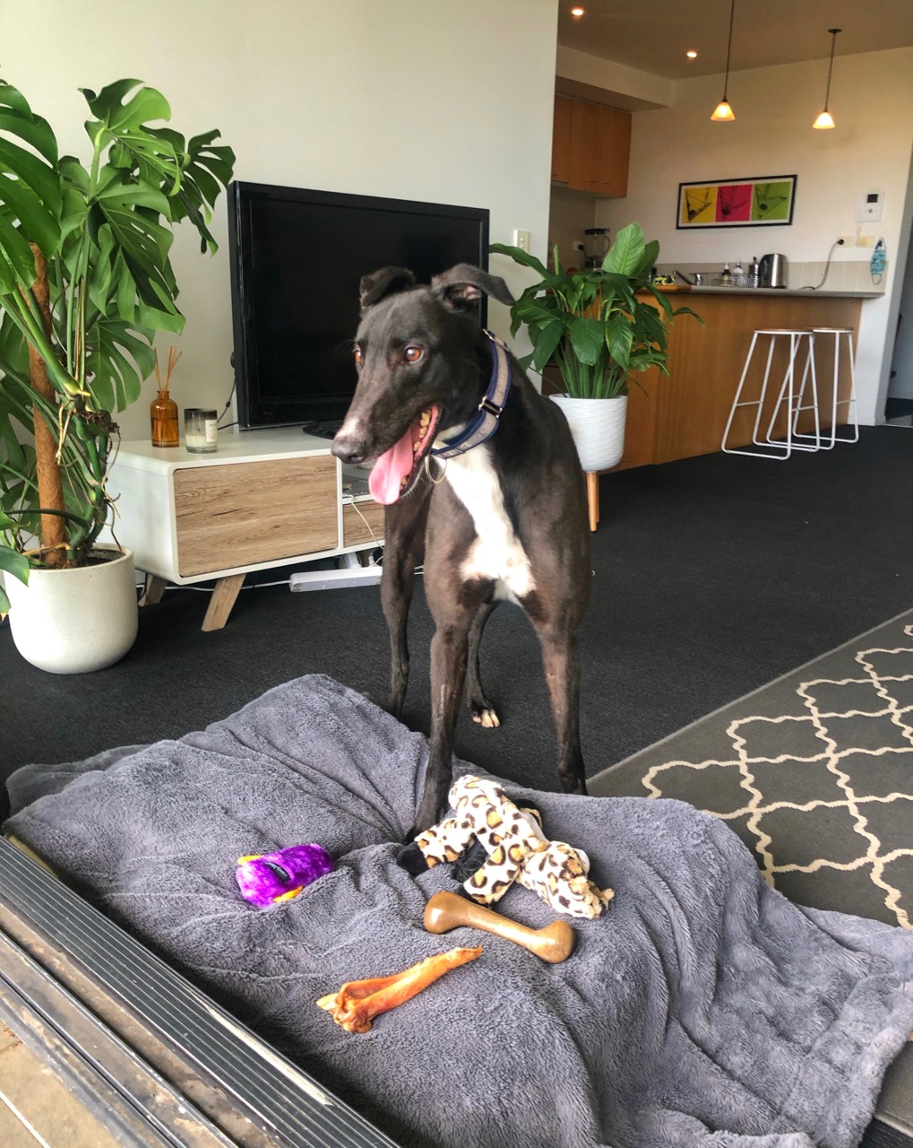 Dogs are pack animals and Greyhounds, in particular, are very familiar with being surrounded by other dogs in their racing kennel environment. For this reason, when left alone without people or other dogs for company, they can be prone to separation anxiety which can manifest in destructive and/or noisy behaviour. Yes, they may "grow out" of it after a few weeks in their new home, but why put the dog through that stress to ultimately live all day alone, while everyone is at work? As a result we do not rehome dogs into households where they are left on their own for more than 4 hours per day, without either people or another dog for company.
