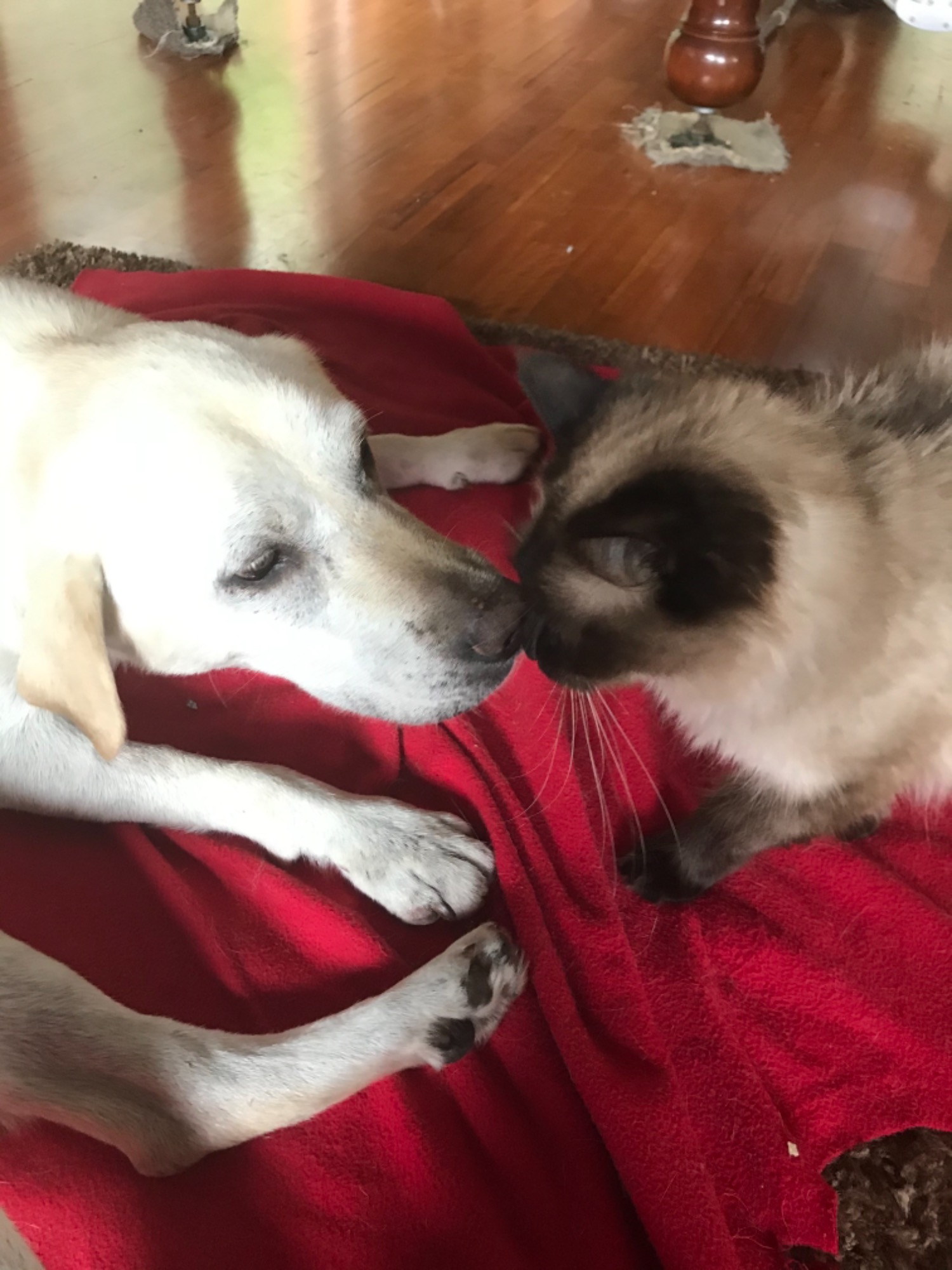 Bonnie will turn 8 next month and currently in care with another Lab who is 6, and 4 adult cats. She has no issues with either and enjoys the company of both.