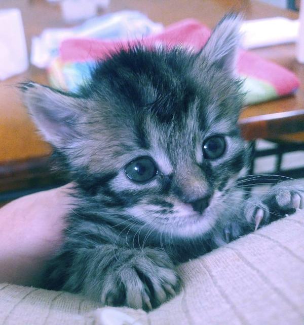 Seba is a lovely tabby female - her brother is Neo. Seba is a loving kitten who was hand reared from a week old. She is used to other felines and older children. She has been handled a lot and would enjoy a home with kids or friendly established pets.