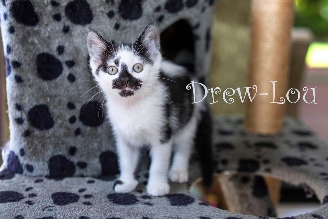 She also finds odd places to sleep but her favourite is behind an open drawer, so if she goes missing, check the draws 😉 Drew-Lou likes the little dog she lives with and often walks up to him and rubs up against him like only a cat can then stands right next to him as if to say ‘He’s mine’ 🐱🐶 She has also grown up in a litter of kittens in a house with another cat and kids. She is litter box trained and eats well.