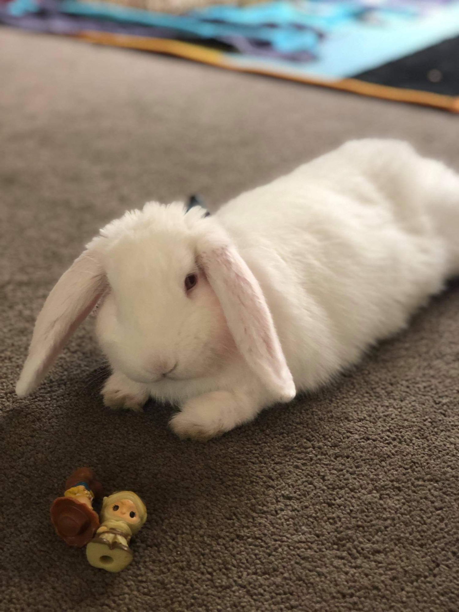 Ellie is a sweet little girl who loves to do binkies & zoomies when playing outside. She is a gentle bunny who is happy being picked up & handled. She loves company & likes to follow people around. Ellie is curious and adventurous and generally very relaxed. She is great with kids & happy tolerating an old, gentle dog. She would be a great addition to any family.