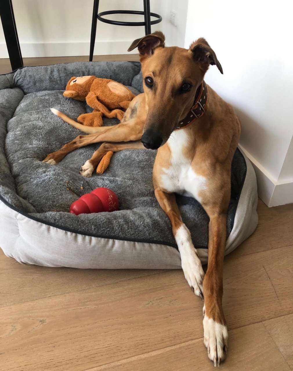 Pax is like the Brad Pitt of the greyhound world. With a striking fawn coat and deep chocolate eyes, he attracts looks of adoration wherever he goes. He tries to stay humble, but it’s hard when he can barely leave the house without being hounded by strangers saying how handsome he is! Sigh… it’s a tough life.