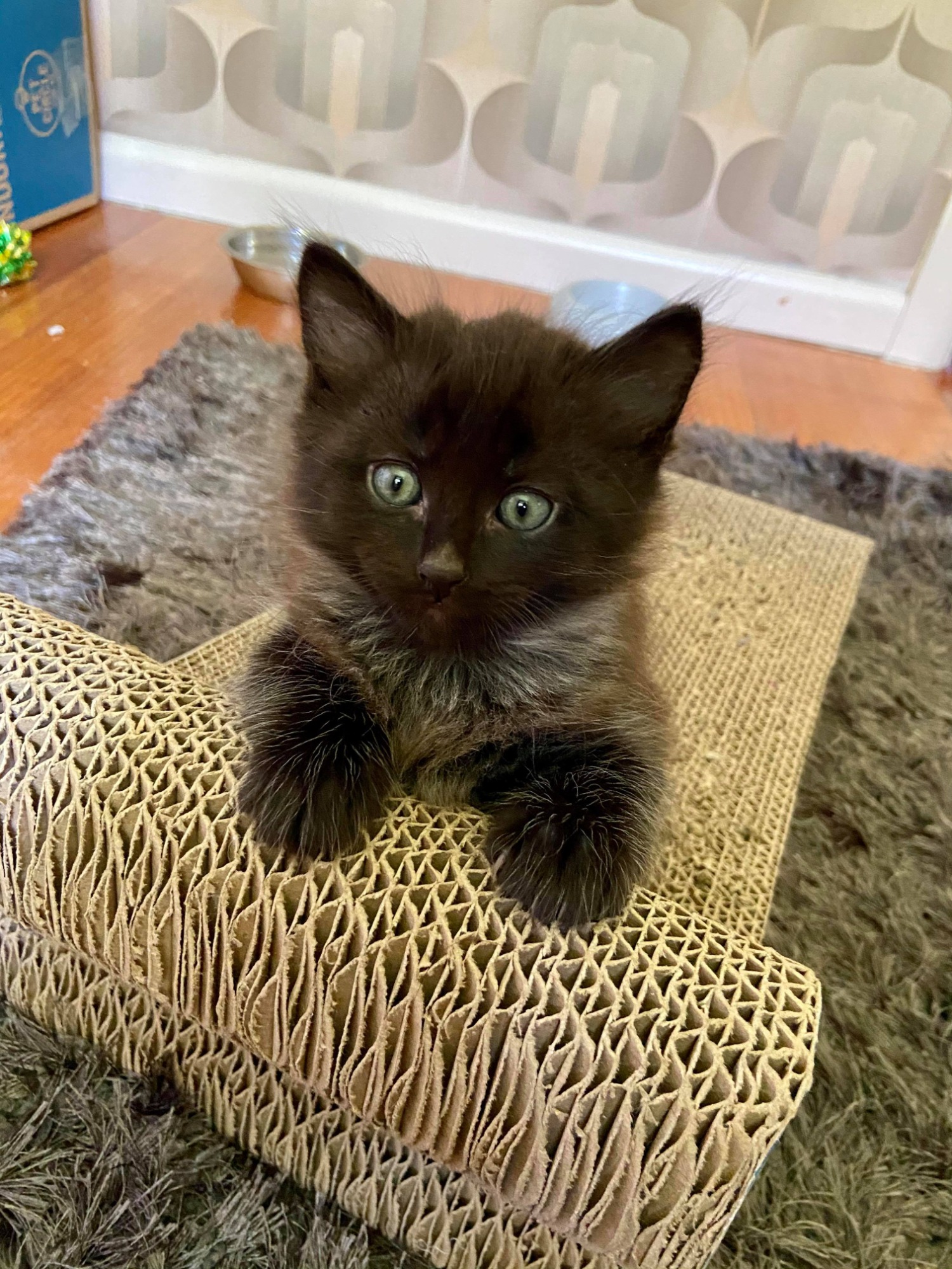 Hotch has a stunning smoky coat and a handsome little face to match. His looks combined with his charming personality, makes him just irresistible. He loves nothing more than to be the centre of attention , at all times possible. Hotch craves affection almost constantly, and he makes it very known when he does. He either usually climbs up on his foster mums chest and head butts her, or he either climbs her pants to get picked up and given a big kiss. This cheeky boy is an avid climber, so he would absolutely love a big cat tower to climb all over and explore. As his confidence grows, so does his interest in exploring all his surroundings; there is no space too small for him!