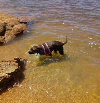 Indie sits nicely in the car, and often falls asleep on the return trip after a big play. She does seem to get a bit overwhelmed by lots of noisy activity, she can swim but gets anxious if you go too far out in the water. She responds to this by barking, otherwise she very rarely barks.