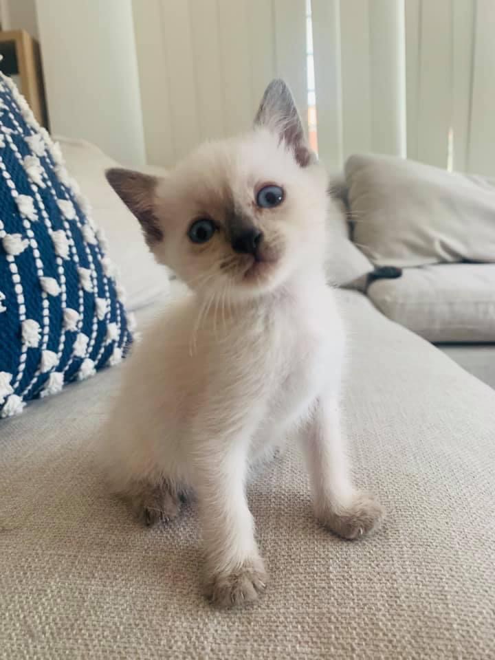 An energetic and playful, but independent little girl with the brightest blue eyes and plenty of sass. She purrs at the slightest of touch, and will jump onto any surfaces she can get her paws on to explore. She does well with other cats but can be edgy with dogs (but can hold her own).