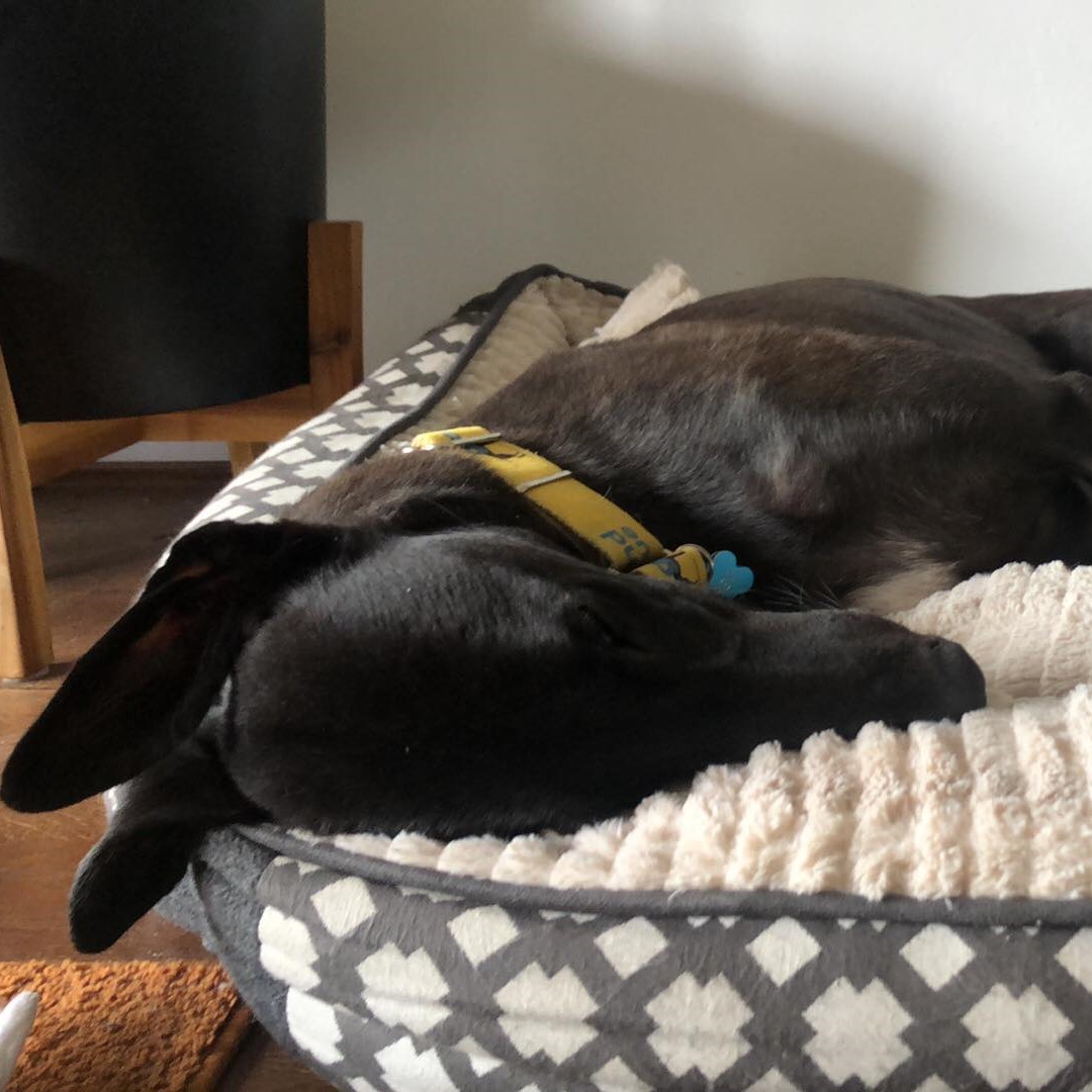 His new favourite thing is sticking as much of his body as he can into bushes to hunt out the smells, so he spends half his time on walks with leaves all over his head. He has also taken a liking to walking through freshly mowed grass until the whites of his paws turn green. He is also very fond of sleeping with his body in his bed but his head on the floor - who knows why!