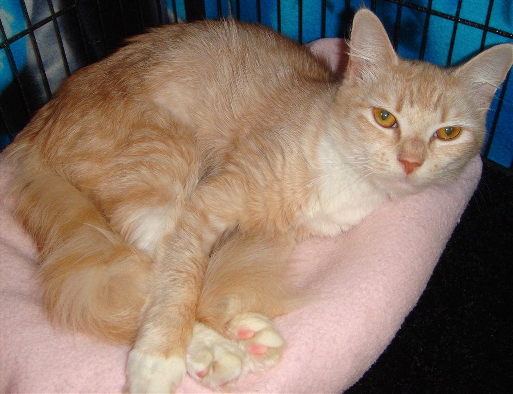 Blossom is very shy, but, once she know you she will happily enjoy a cuddle or sit on your lap for a brush or a pat. She has the most beautiful golden eyes and her coat is the palest ginger almost like a deep cream color. She would prefer to be the only child and would appreciate a quiet loving home. Only 20% of ginger cats are female and they are noted for being very affectionate.