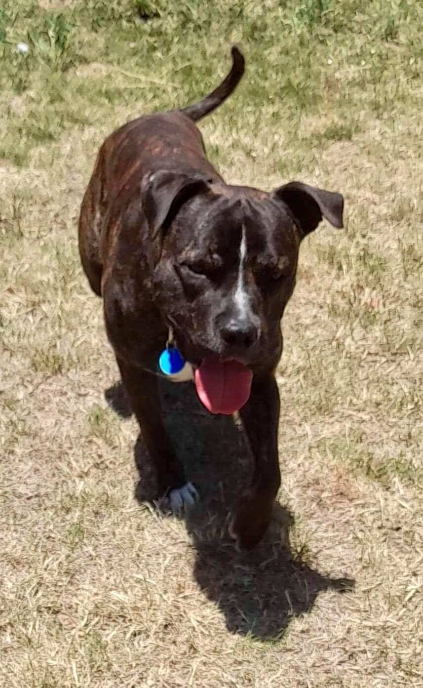 Louie is currently in care with another staffy (female), a small breed silky terrier and a very very bossy 19 year old Mini Foxie – he is very respectful of all of them but does enjoy a play.