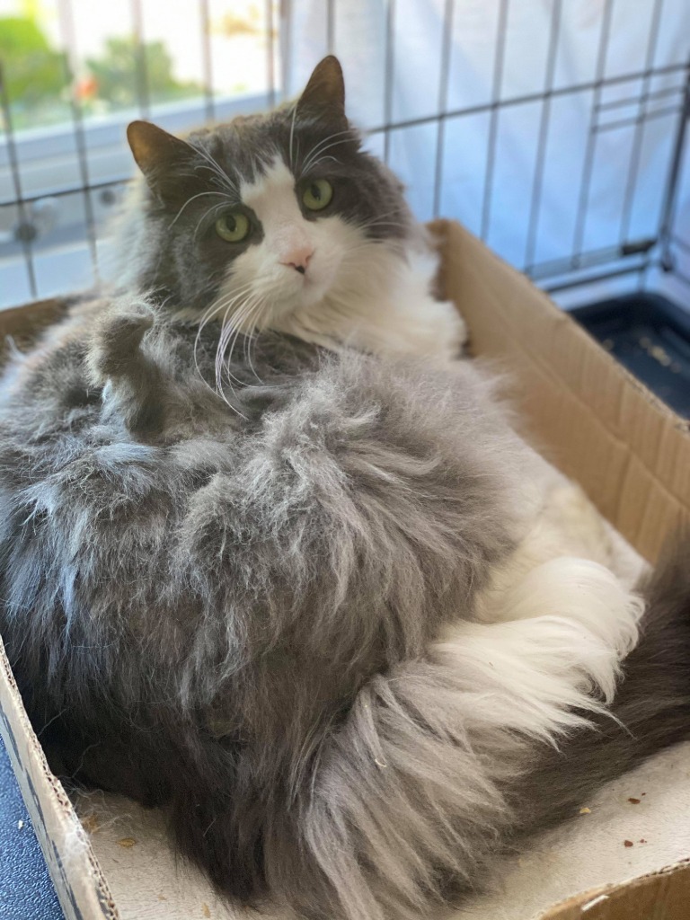 Any adopter will need to be dedicated to having him regularly groomed, and not take any grumbling and swiping personally. He's just a shitty kitty sometimes. If you are that person, you will be rewarded with chirps, head rubs, condescending eating of fishy food, and assistance while working from home. Oh and get a good vacuum cleaner, you'll need it!