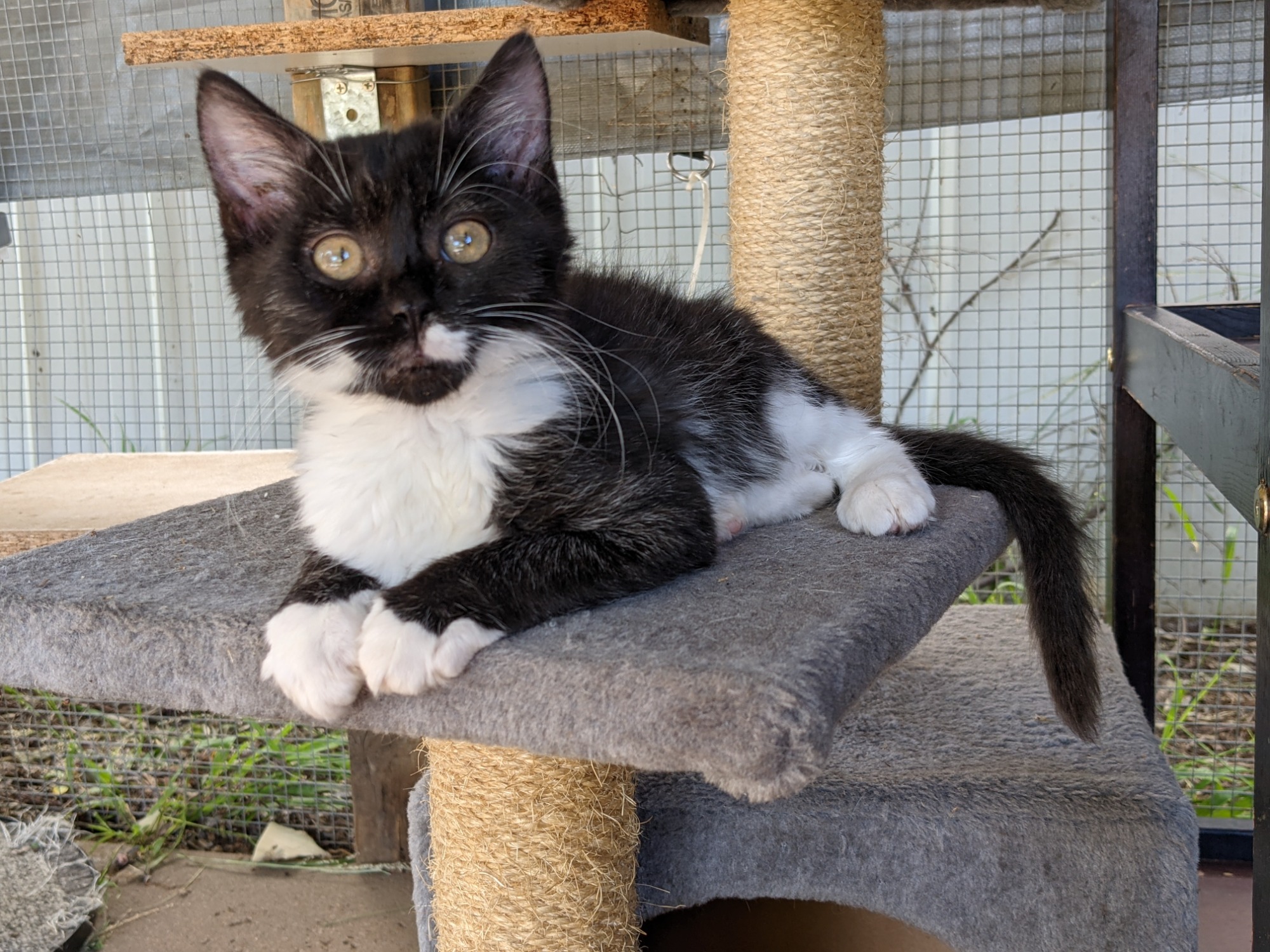 Maverick is a fluffy black and white kitten with a playful cheeky attitude. Super affectionate good with children and other cats.