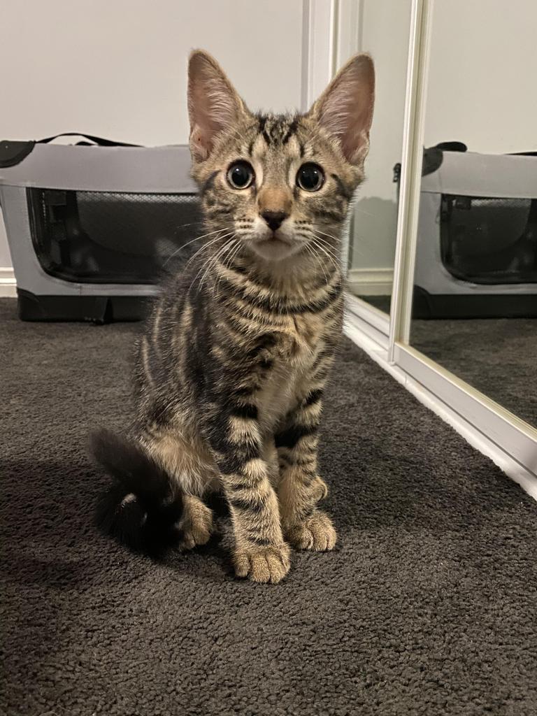 Good looking boy Malo is now ready for meets and greets and hopefully will find the family of his dreams. Malo is a large tabby kitten who is currently in foster care with sister Tiny and brother Briggs. Malo is the more confident of the three kittens and always first to try a toy. The trio are very quiet kittens and only just learning to play and have fun with toys. A home with lots of attention and toys will suit Malo. All three kittens are getting used to being patted and held - not fans - but we're working on it!