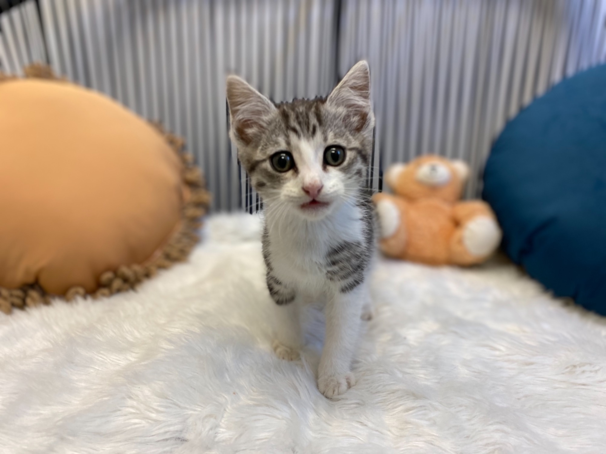 George is a 9 week old silver tabby male domestic short hair kitten. He came in with his three brothers and together they made up 'The Beatles' hence his cute namesake! George started off as a very timid kitten but with some love and socialisation he has slowly come around to learn to accept love. He is a bit shy at first with new people but we know he will flourish once he settles in to a loving home :)