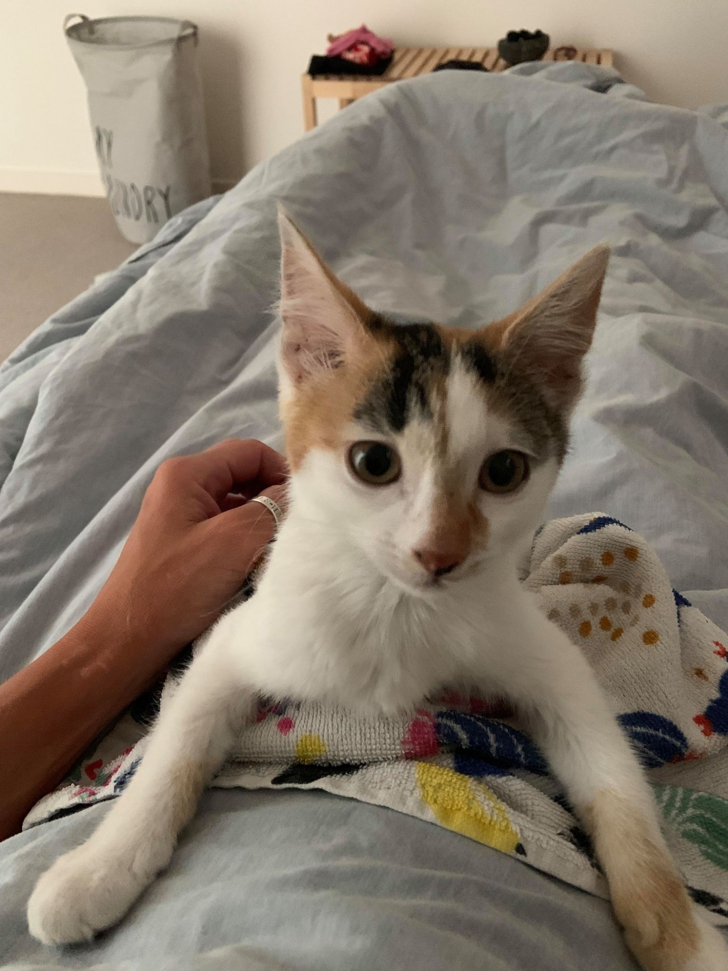 Merrita is a darling sweet kitten. She just loves her foster carer and loves playing hide and seek between the pillows.