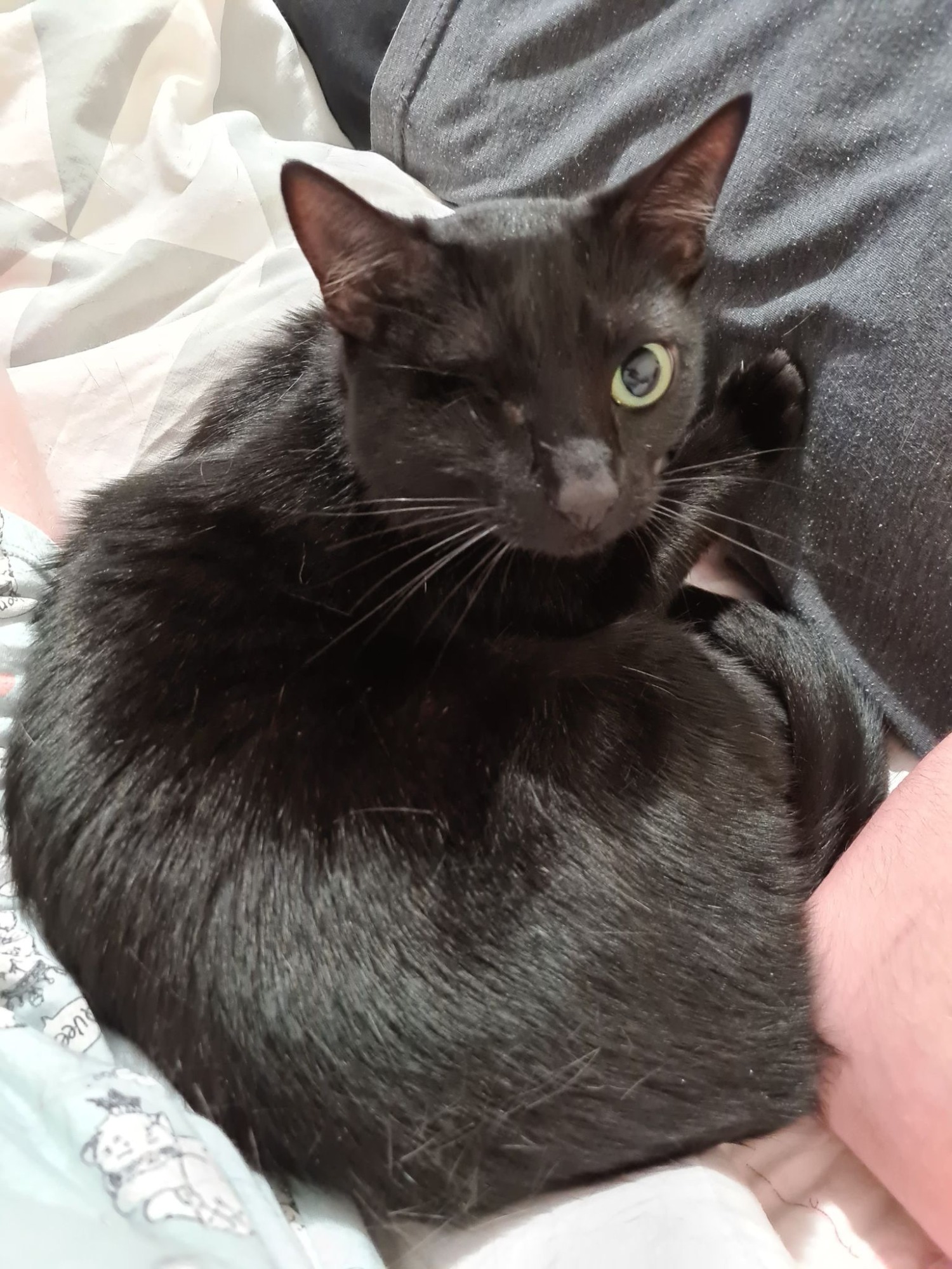 Chelsea is approx 5 years old domestic shorthair black & white girl with a very distinctive look! Chelsea has had 1 eye removed due to a traumatic injury to the eye from an attack whilst she was outside.