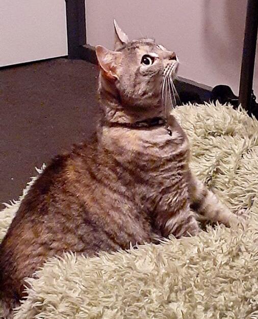 Very slowly, over time, the combination of medication & behavioural techniques worked for Luna. She started rolling over in her bed and chirping, showing her belly. She started coming out of her crate, and then her room, and exploring the house. You could always tell where Luna was from the hisses! But even that died down. Then there was the day that a family walked in to adopt another cat, and Luna walked straight up to the mum and demanded attention... then head booped the hand that came to pat her. We were floored, never did we think this would happen! The family offered to foster Luna and she's blossomed in their care and is now ready for her second and hopefully last forever home.