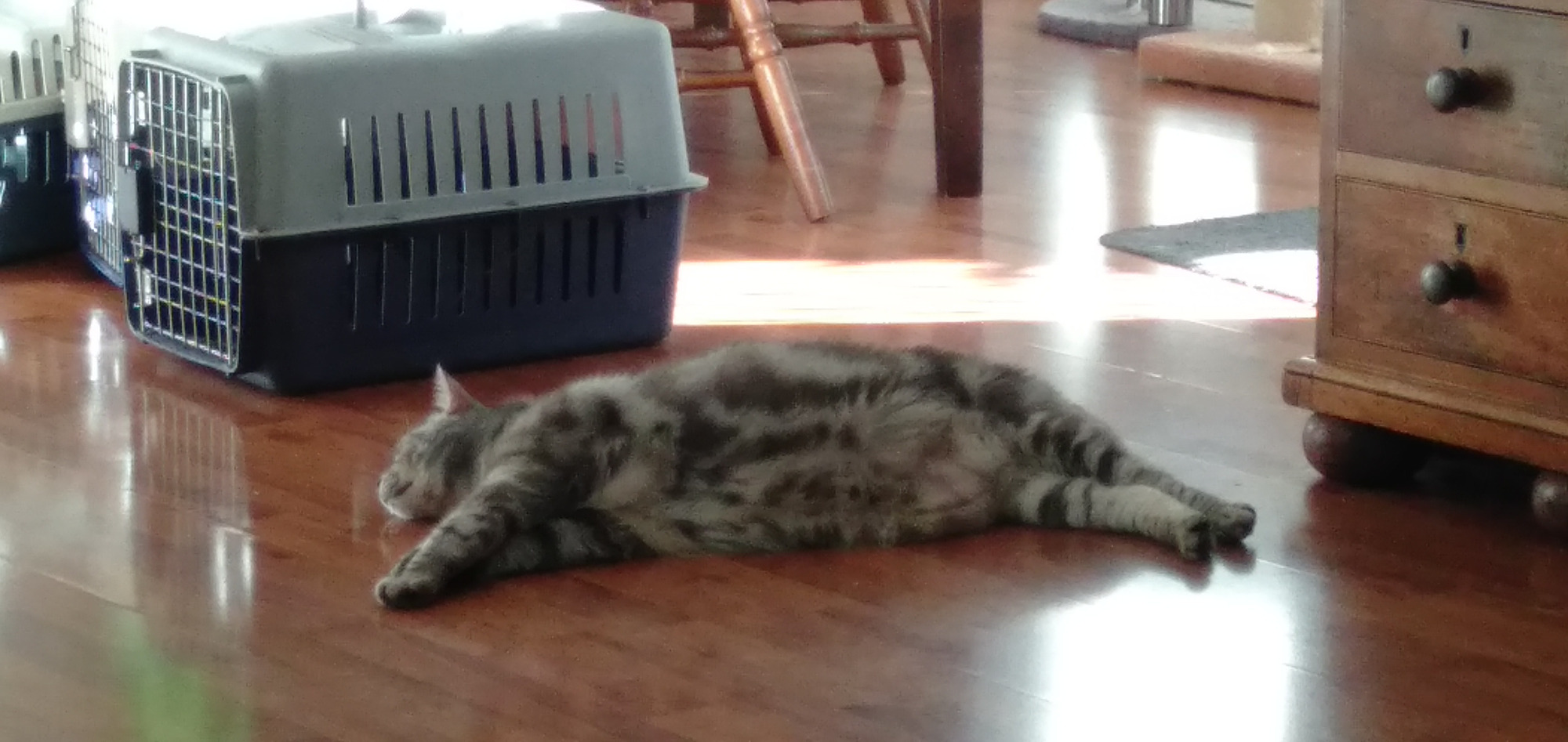 The kitten in him comes out a couple times a day which involves zooming around the house. Then it's time to flop down and snooze.