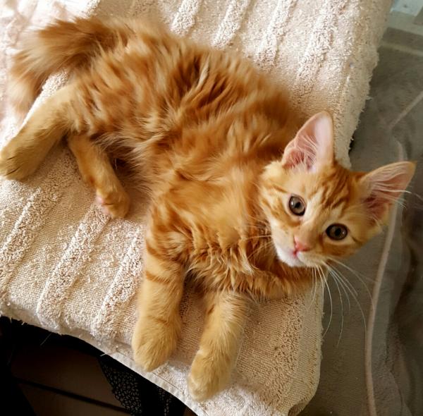 Maddie is a fluffy girl, like her sister and mum. She doesn’t demand attention, but is happy to accept being picked up and stroked. She’s quite playful and was the first kitten to find out how much fun a toilet roll can be! She does love to play with her brother, the mighty Milo.