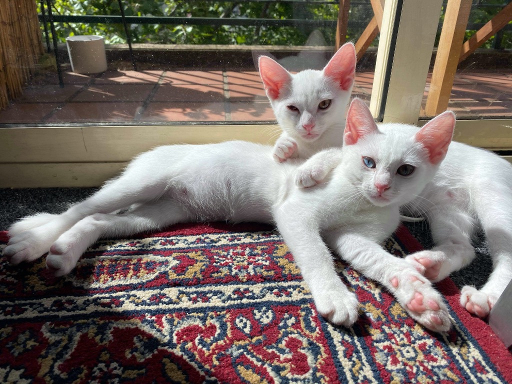 Being white, they'll both need to be kept indoors or in a shaded outdoor enclosure to protect them from the sun. They'd also love harness and leash walks in the early morning or late afternoon when the sun isn't blazing!