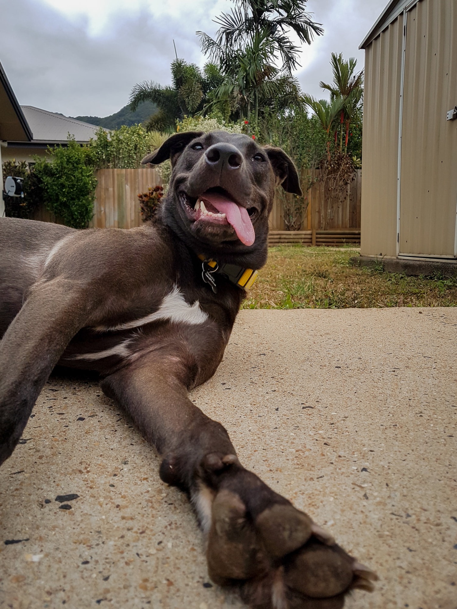 Among her favourite things are people, food, belly rubs, playing fetch, tug-o-war and zoomies. She would make a good companion for an active family and a good guard dog as she is very alert and has a good bark. She is very curious and playful and will make you laugh with her antics. When you’re outside she is a bit of a sticky beak and will follow you around while you do chores in the garden. When left alone she is happy to laze about and when it’s playtime she’s super excited and full of energy. She is very fast so she would do well in a big backyard or property where she could zoom to her hearts content. She loves car trips and travels well in the car. She can sit, drop and stay however could do with some more training to learn how to walk on the lead and not jump for attention. She is very food motivated and willing to try anything for a treat (like posing for photos 😃).