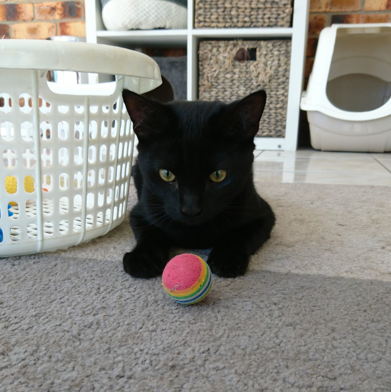 Toby is one beautiful five month old kitten who knows how to keep his eye on the ball. He adores being picked up and cuddled, and is a real snugglepot. Toby is also super playful and energetic – until its nap time. His glossy black coat is short and requires no maintenance (he is meticulous in his grooming). Being quite young Toby will adapt to, and settle well in to, any household.