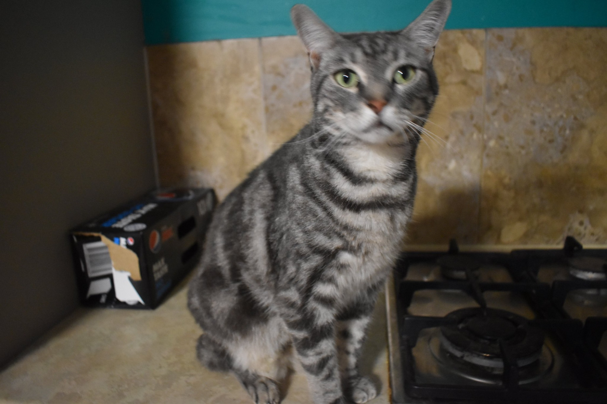Mistral is a confident and affectionate kitty. She loves her pettance loving human company. She gets along with her sister Mythril but doesn't need to be adopted together with her. She is also starting to get along with the dogs and cats in foster care. She likes to sit on top of the bird cage and other high places to view her domain.