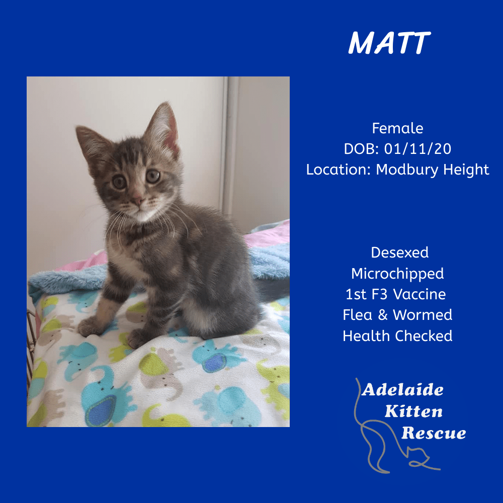 If you would like to meet Matt please pm the page, email us at adelaidekittenrescue@gmail.com or call or text us on 0434 131 997.